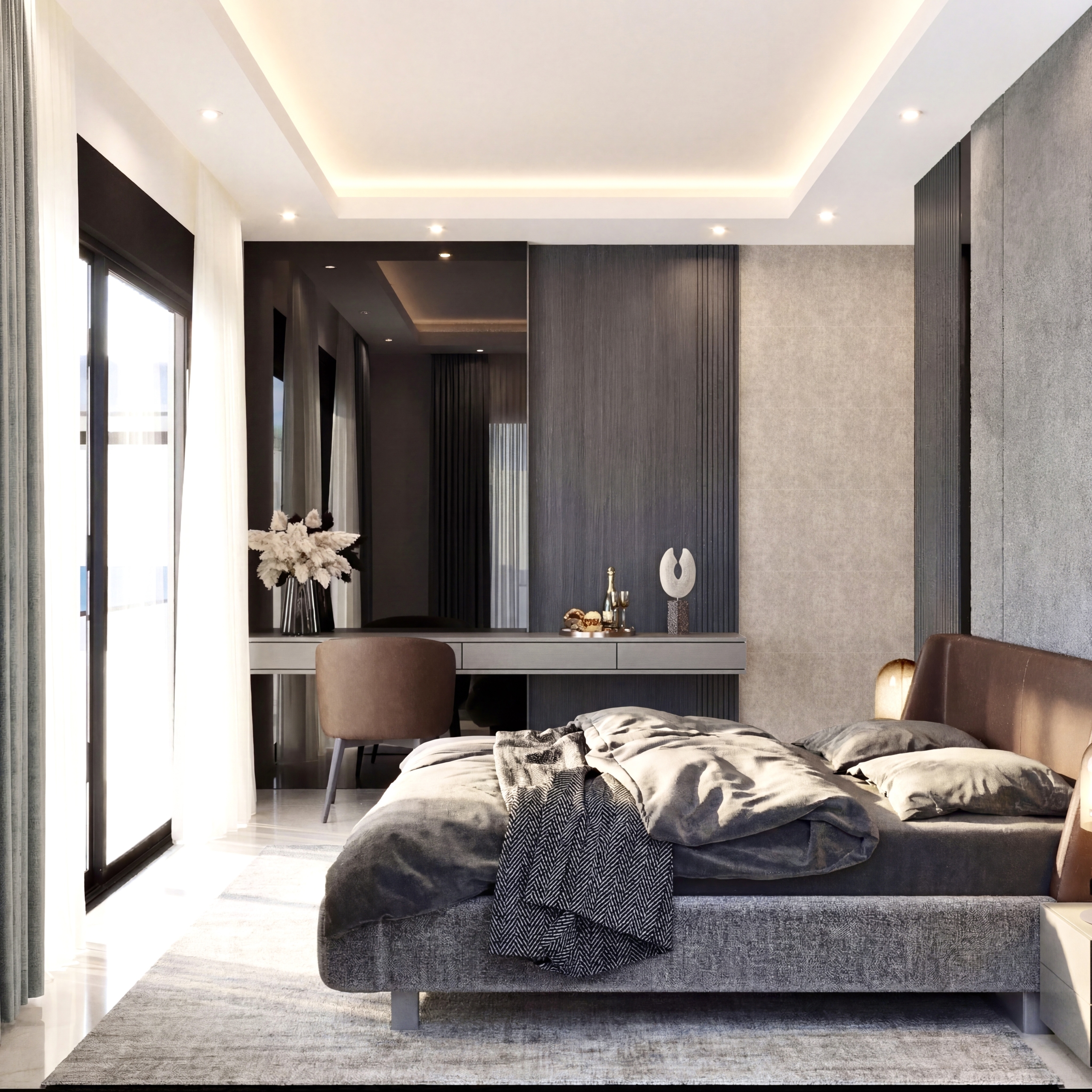 Yatak odası, görsel karmaşadan arındırılarak daha kontrollü ve dingin bir atmosfer oluşturacak şekilde kurgulandı.