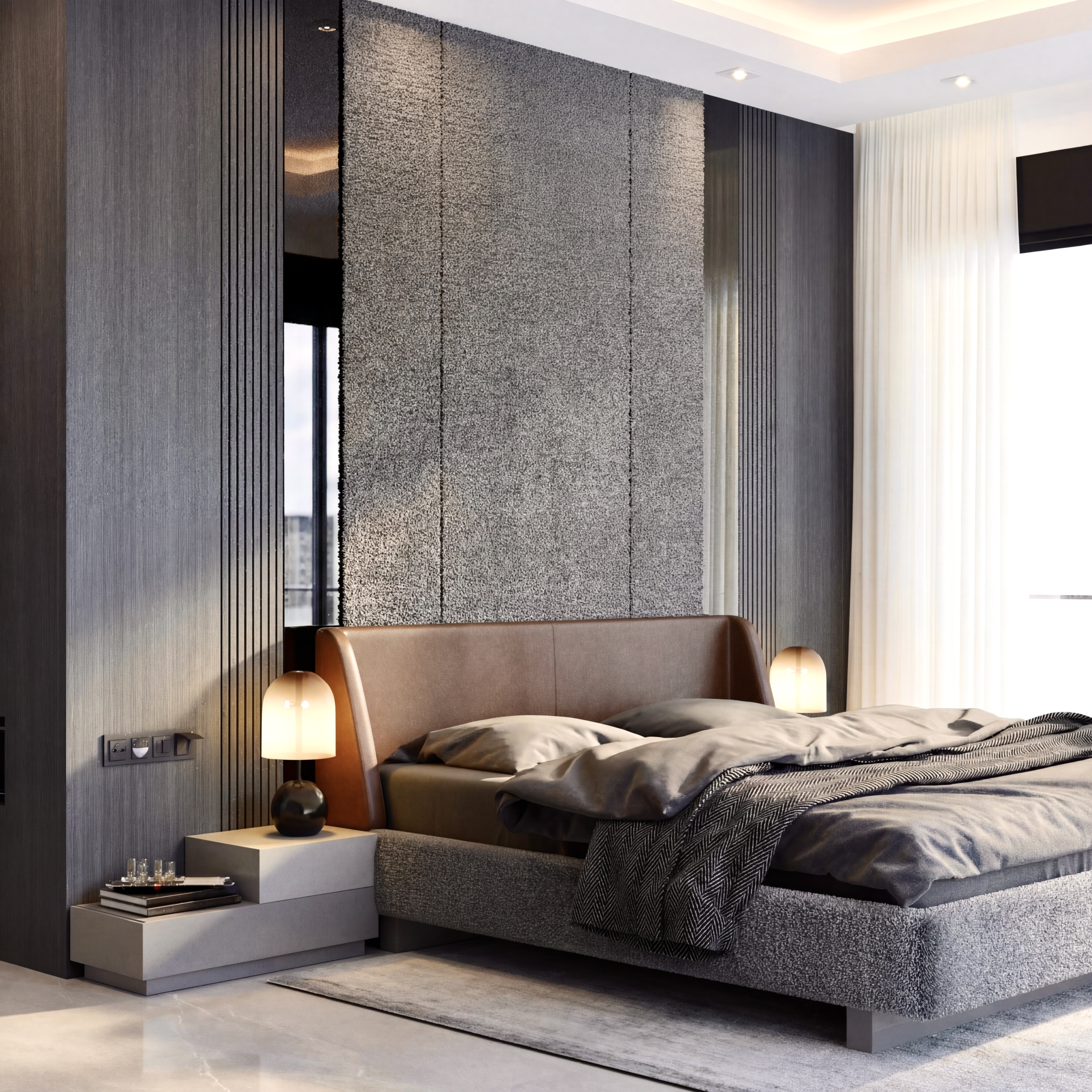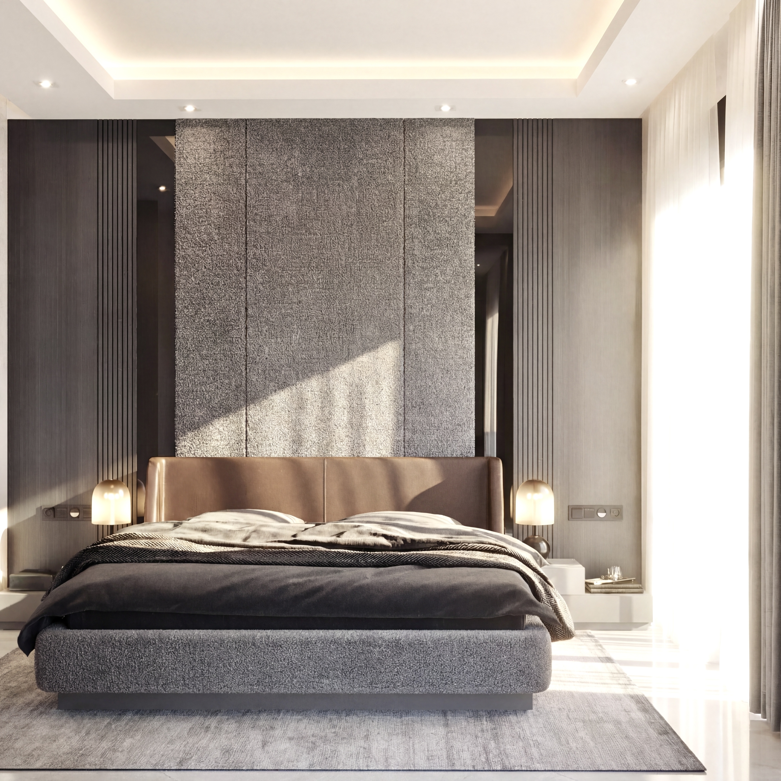 Başlık duvarında oluşturulan katmanlı yüzey kurgusu,mekana hem odak hem de derinlik kazandırır.