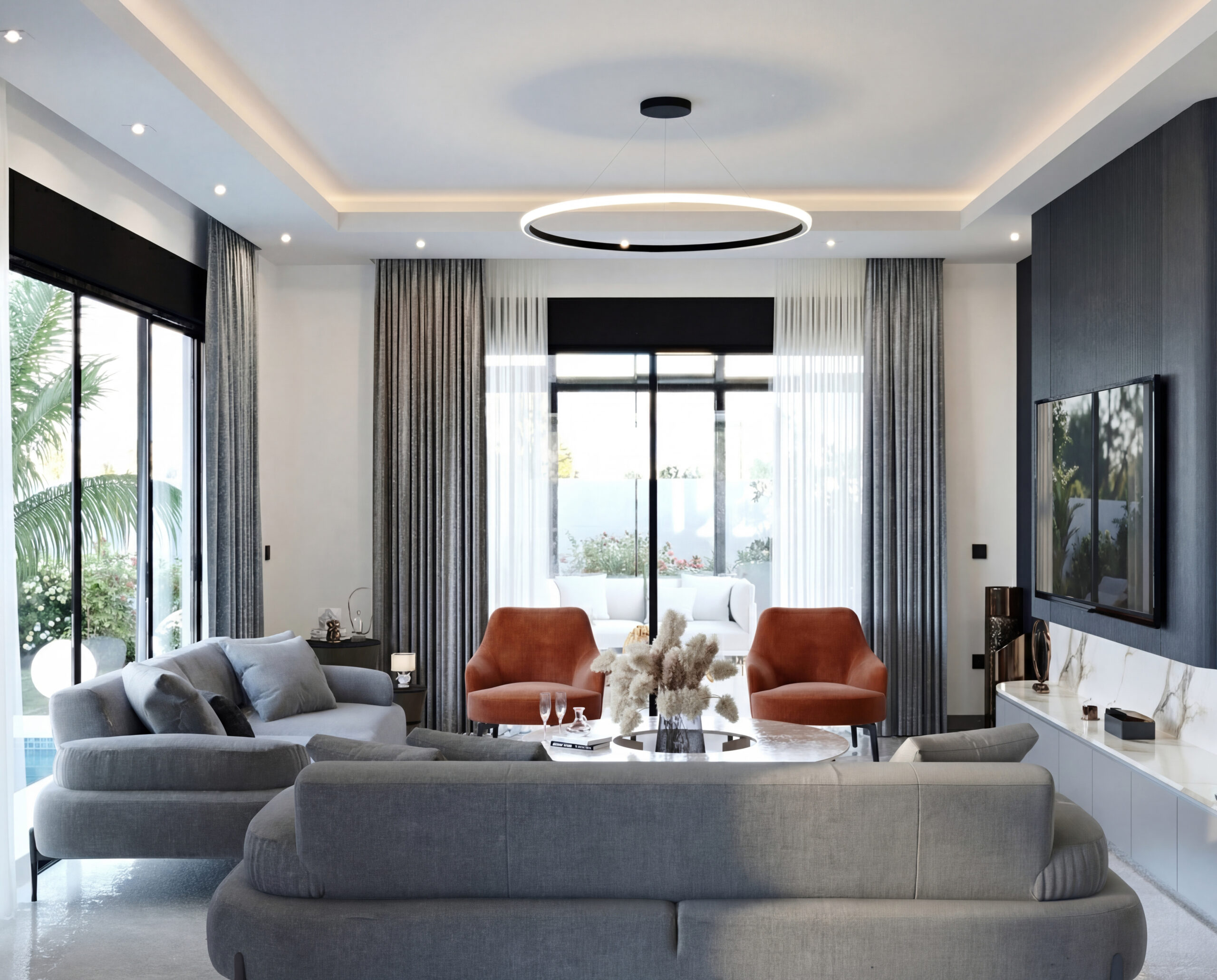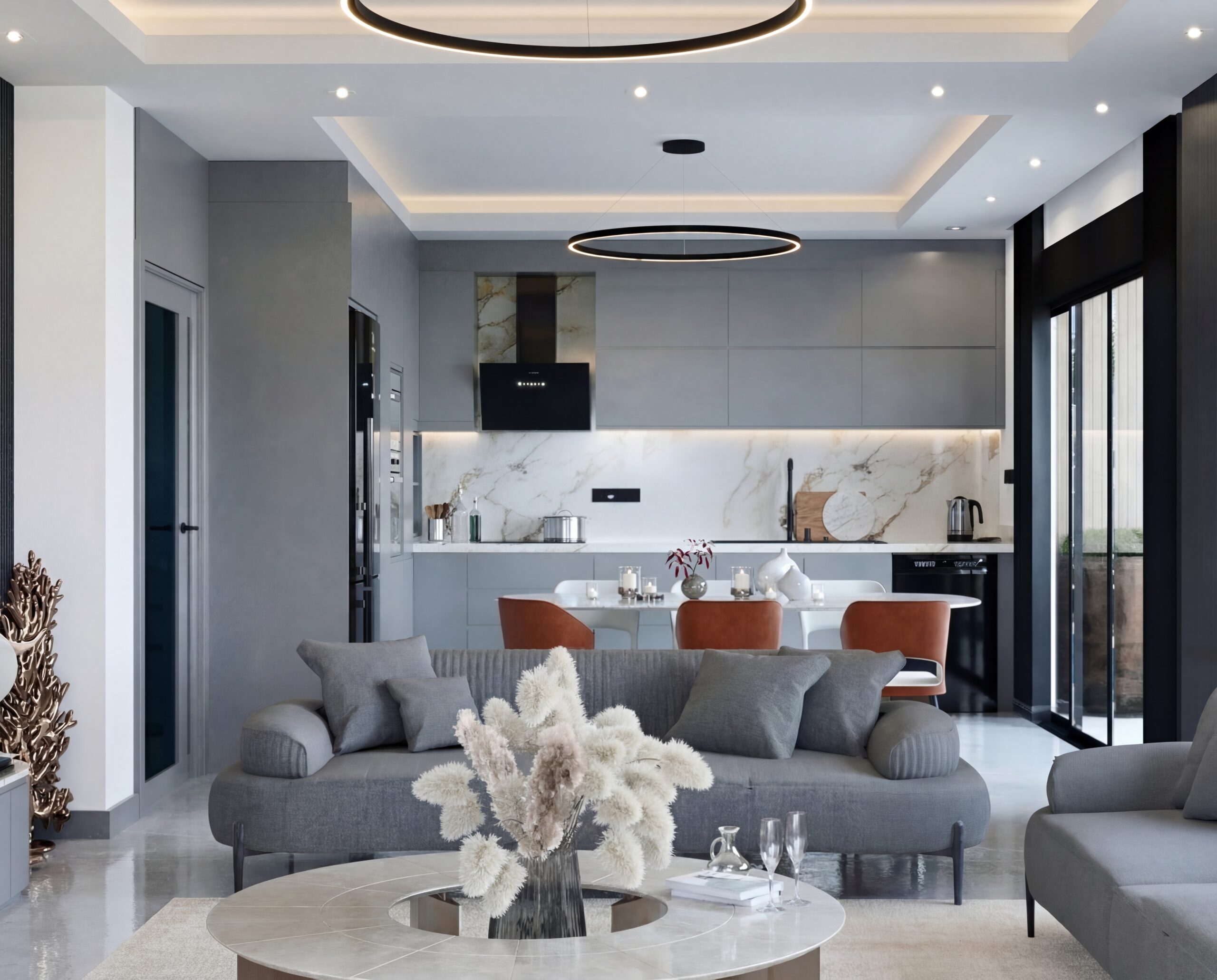 Salon, mutfak ve dış mekan arasında kurulan görsel ve fiziksel ilişki sayesinde mekanlar tek bir akış içinde okunur hale getirildi.