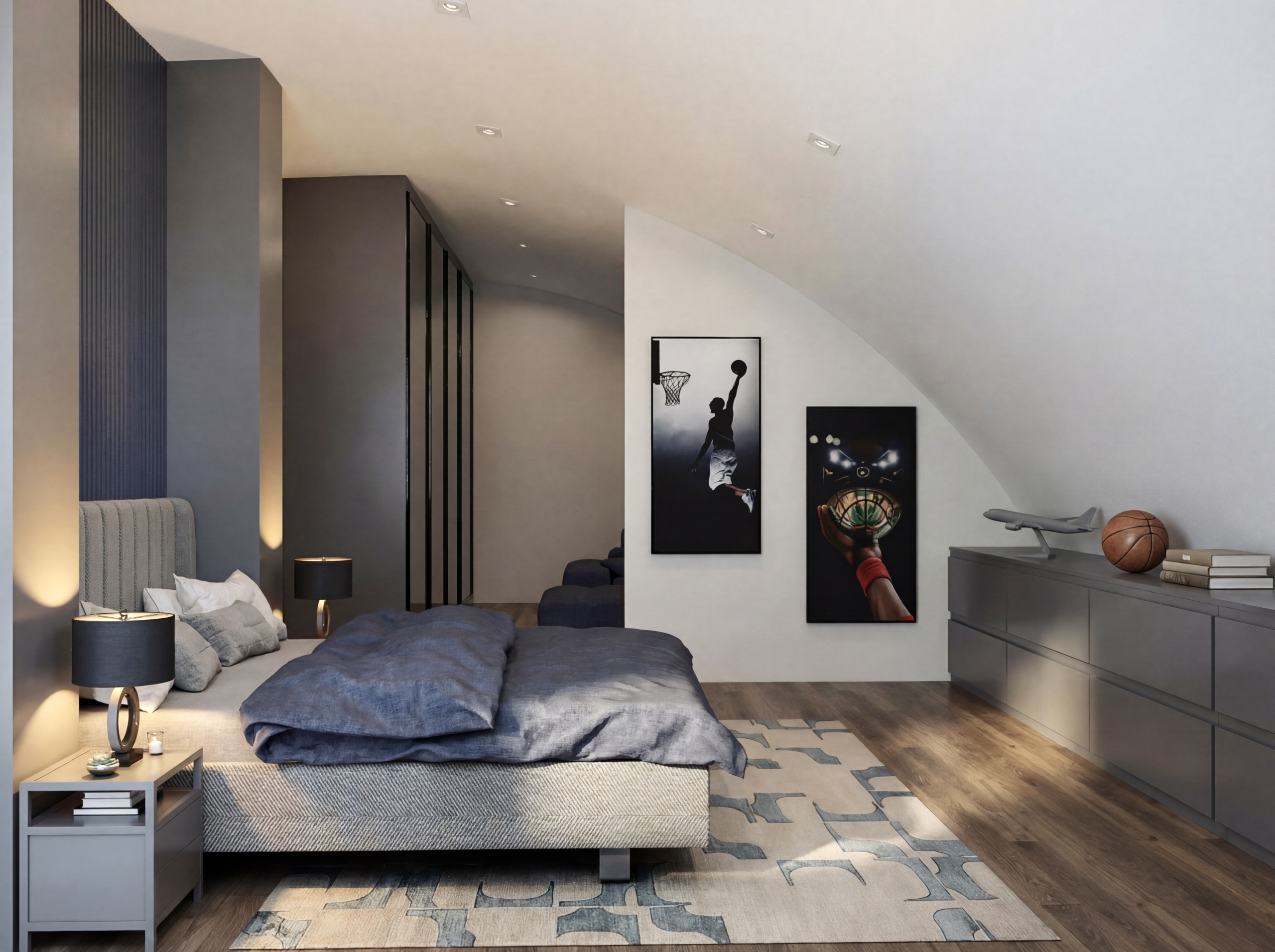 Alan; uyku, çalışma ve sosyalleşme işlevlerini tek bir plan içinde çözerken, mekânsal hiyerarşi korunarak bölümlendi.