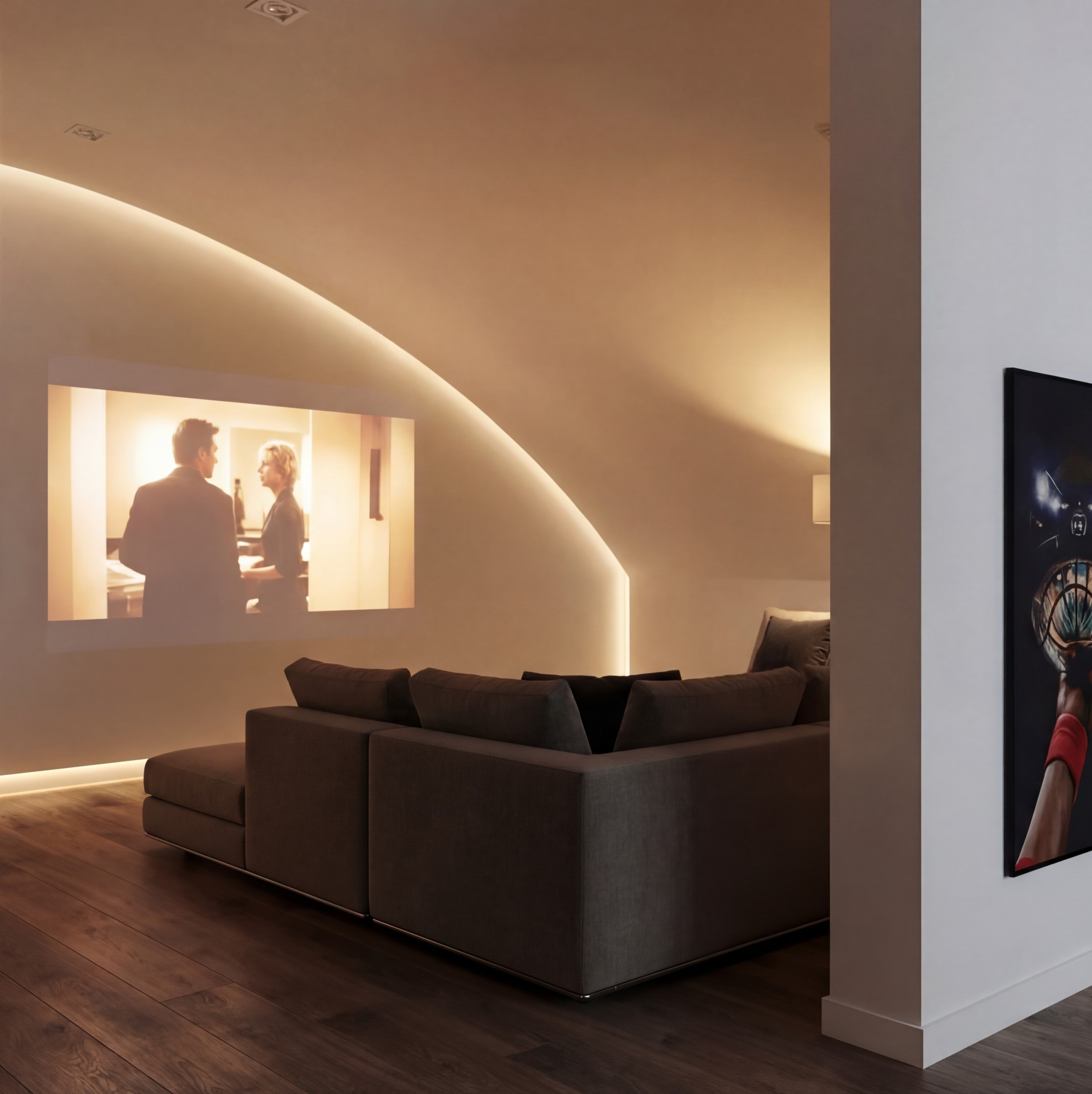 Kavisli yüzey, sinema alanı için doğal bir arka plan oluşturarak mekâna yön verdi.
