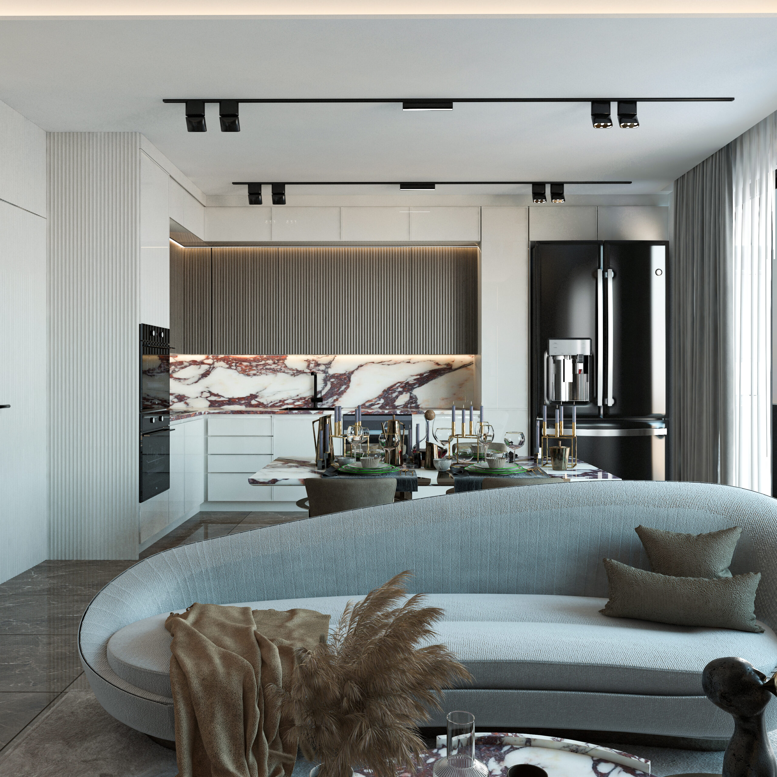 Açık plan mutfak ve salon kurgusu, mekânsal sürekliliği güçlendirirken; gün ışığını içeri alan geniş açıklıklar sayesinde alanlar arasında kesintisiz bir ilişki kurulmuştur. Bu yaklaşım, iç mekânda ferah ve akışkan bir deneyim oluşturur.