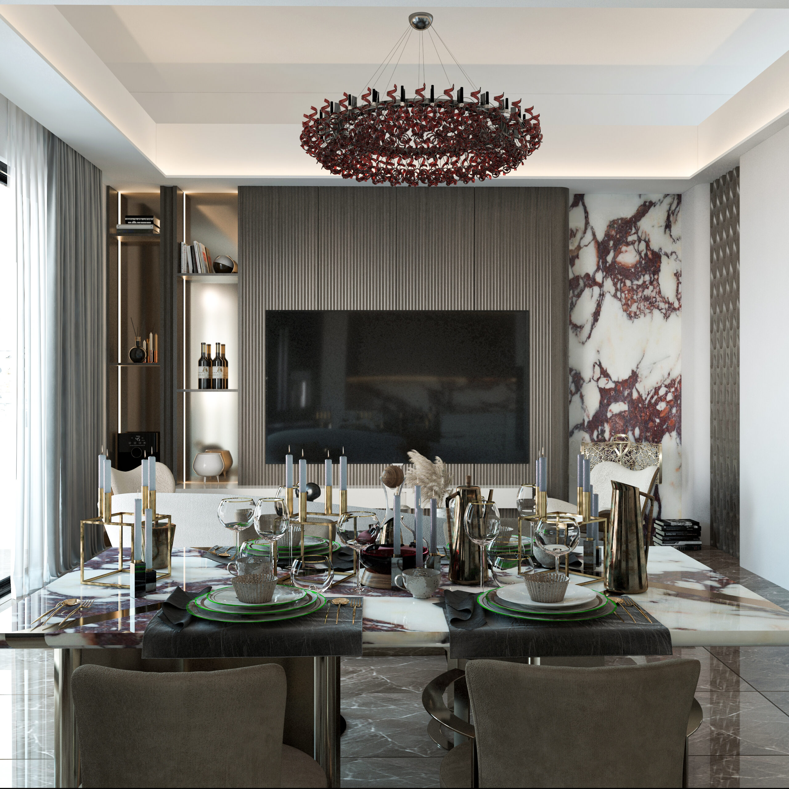 Mekânın merkezinde konumlanan özel üretim mermer masa, doğal damar yapısı ile güçlü bir odak noktası oluştururken; bronz ve altın tonlarında seçilen tamamlayıcı elemanlar, tasarıma rafine bir karakter kazandırır. Yemek alanı, yalnızca işlevsel bir hacim değil; sosyal etkileşimin ve paylaşımın gerçekleştiği bir odak alanı olarak ele alınmıştır.