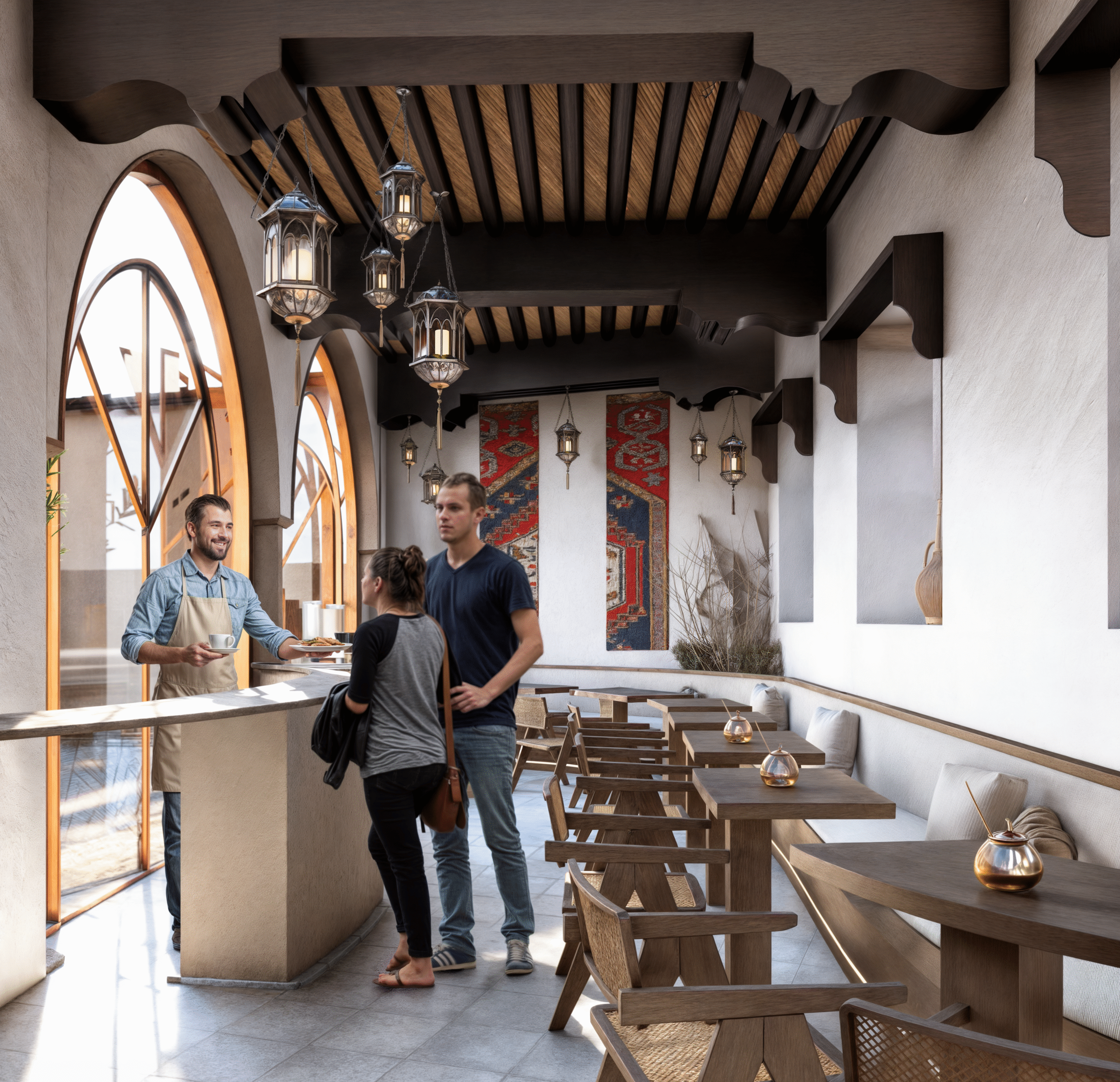 Merkezde konumlanan avlu, projenin sosyal çekim noktası olarak kurgulandı. Açık ve yarı açık alanlar arasındaki geçişler, kullanıcıyı yönlendiren ve mekân deneyimini zenginleştiren bir akış oluşturacak şekilde planlandı. İç mekânlarda ise daha kontrollü, samimi ve yoğun deneyimler hedeflendi.
